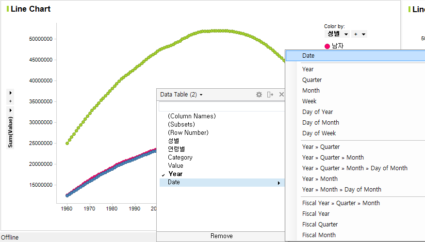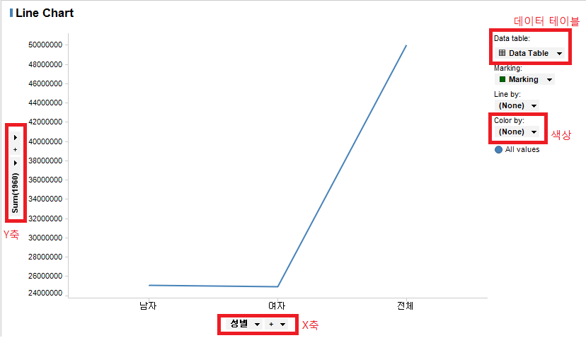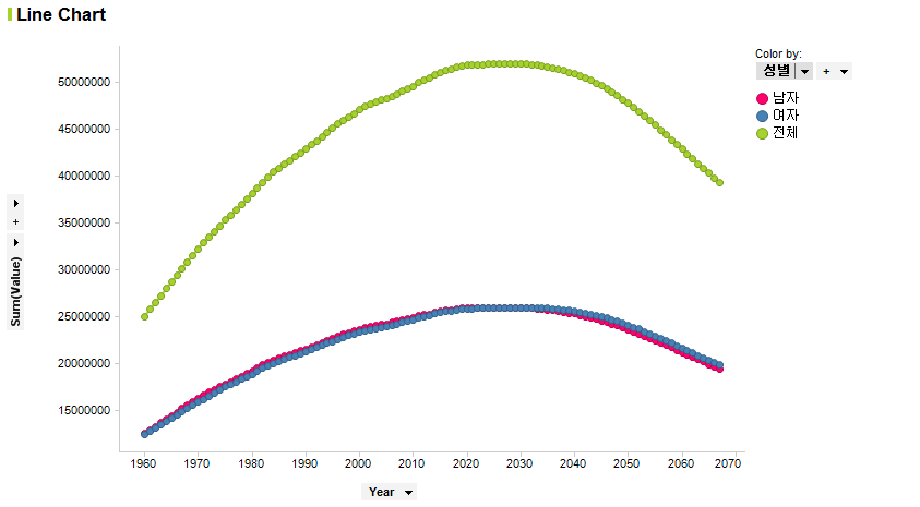 처음과 달리 현실적인 수치가 나옵니다. 전체 총 인구 및 성별 인구 현황이 년도별로 출력됩니다. 깔끔한 선도 좋지만 각 지점에 대한 데이터를 확인 할 수 있도록 Mark를 추가해봅니다. Line Chart의 Properties를 실행합니다.