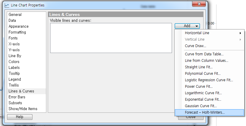 위의 데이터는 R 패키지 안에 있는 AirPassengers라는 데이터입니다. 이번에는 다른 방식으로 Forecast를 진행해보겠습니다. Line Chart에서 Properties - Lines & Cusves로 이동하여 Add를 누르면 다양한 선에 관련된 옵션을 볼 수 있습니다.