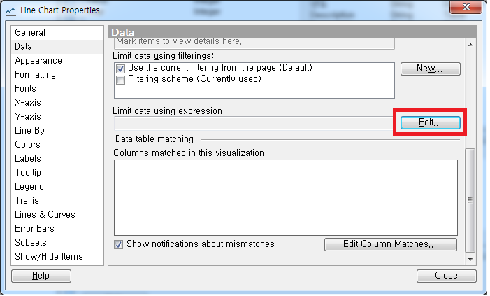 활용하기에 따라서는 명목형(분류형) 변수를 부여하기도 함 - Data Table : 현재 열려 있는 Spotfire Analyst 내에 Data Table이 다수 인 경우 선택할 수 있음, Data Table이 변경되면 현재 설정된 기준이 모두 초기화됨(주의)