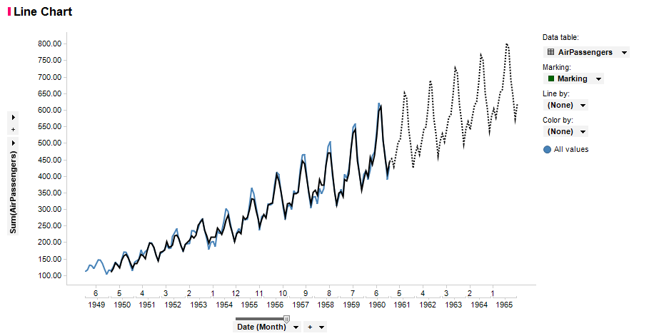 각 지점별로 Mark가 추가되었습니다. 각 Mark에 마우스 커서를 올려 놓으면 지정한 값들이 출력됩니다. Line Chart는 주로 추세를 많이 보기 때문에 자연스럽게 향후 예측에 대한 Needs가 있을 수 밖에 없습니다. Spotfire는 간편한 시계열 예측 기능을 제공하고 있습니다. 물론 제약사항이 있지만요.