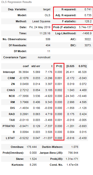 result = sm.ols(formula = 'target ~ CRIM + ZN + CHAS + NOX + RM + AGE + DIS + RAD + TAX + PTRATIO + B + LSTAT', data = boston).fit()