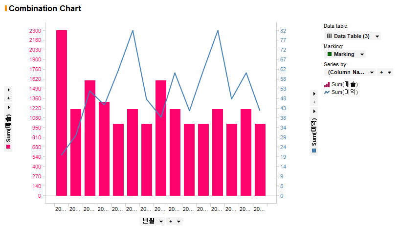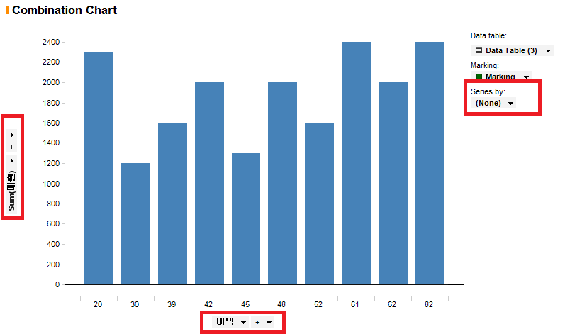 차트는 제목처럼 Combination Chart이지만 형태는 Barchart처럼 보입니다. 붉은 사각형으로 표시된 부분을 변경하여 Combination Chart를 표현해보겠습니다. 각 부분에 대한 설명은 생략하겠습니다. Barchart, Line Chart와 동일하니 이전 포스트를 참조하시면 됩니다. 먼저 X축을 "년월"로, Y축에는 "이익"을 추가합니다.