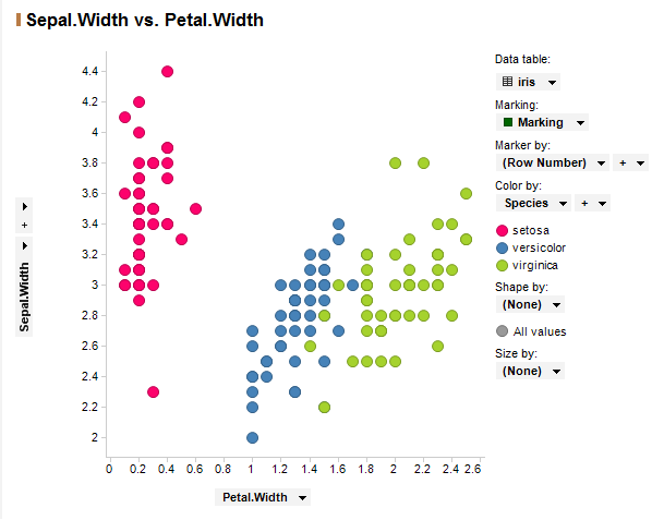 다른 것들은 그대로 두고 X축만 바꿔보겠습니다. X 축을 "Petal.Width" 변경하면 아래와 같이 Scatter Plot이 변경됩니다.