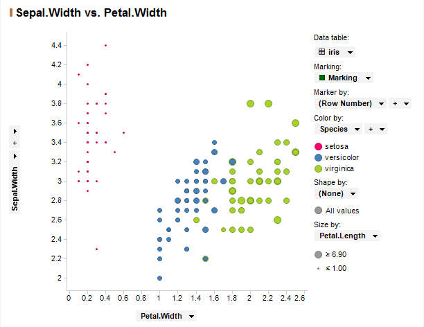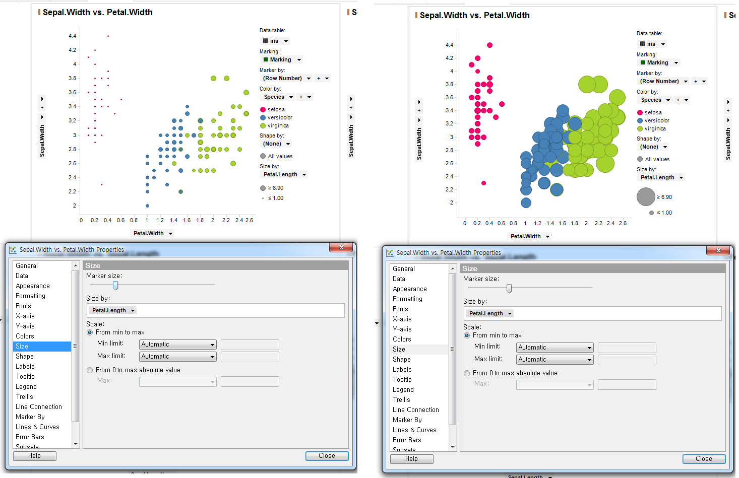 Petal.Length 값에 따라서 점의 크기가 달라지는 것을 확인할 수 있습니다. "Setosa" 종은 Petal.Length, Petal.Width가 모두 다른 종에 비해서 많이 작은 것을 알 수 있습니다. 점의 크기가 작으니 좀 더 키워보겠습니다. Scatter Plot의 Properties에 Size탭으로 가면 Marker size라는 옵션을 확인 할 수 있습니다.
