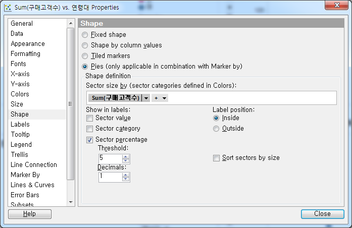 - Shape By : 점의 모양을 결정, 변수를 지정하여 가변적으로 변경되도록 설정 가능