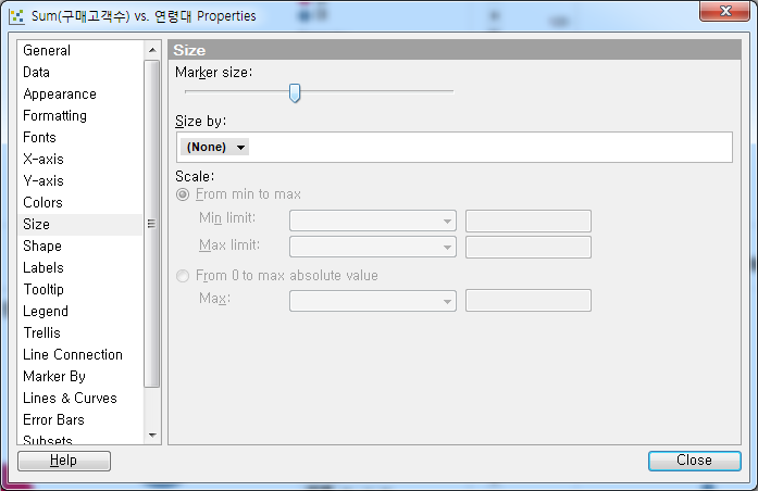 원하는 형태로 변경을 위해 기준을 수정하겠습니다. Scatter Plot에서는 주로 다음과 같은 부분을 수정합니다.
