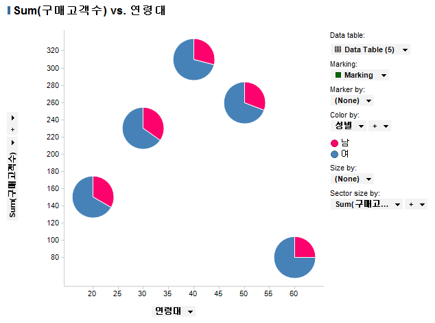 그다음 "sum(구매고객수)"로 변경하고 Marker by에서 (Row Number)를 제거합니다. 참고로 (Row Number)로 되어있으면 행하나하나를 점으로 출력하게끔 설정하는 조건입니다.