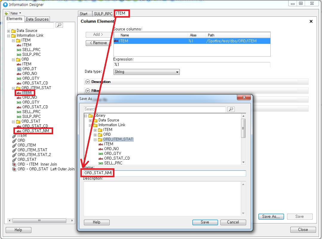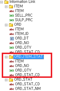 일단 새로운 Information Link를 생성하고 "ORD_ITEM_STAT" 폴더에 있는 모든 element들을 등록합니다.