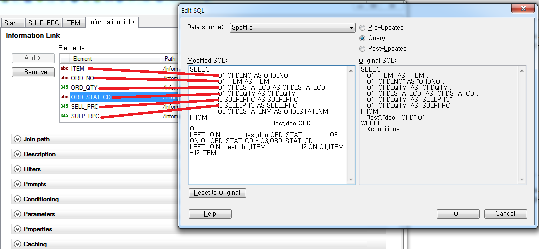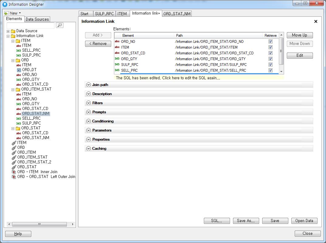 이런경우 Fake element를 생성하여 쉽고 Information Link를 만드는 방법이 있습니다. 물론 이 방법은 정공법이 아니기 때문에 Information Link나 Information deisgner에서 제공하는 관리 기능이 전혀 동작하지 않습니다. 예로 ITEM, ORD, ORD_STAT이라는 테이블이 있고 각 테이블로 부터 Column들을 가져와서 아래와 같이 등록했습니다.