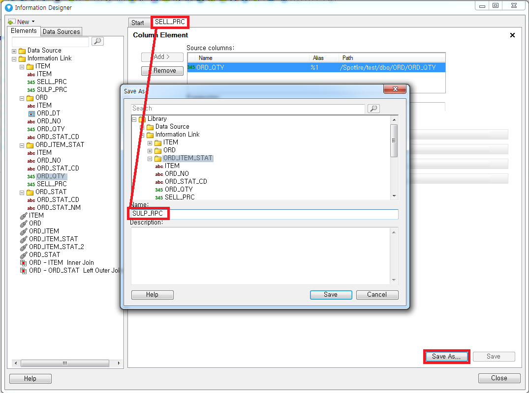 그다음 "Save AS"를 클릭한 후 "ORD_ITEM_STAT" 폴더에 "SELL_PRC"라고 저장합니다. 그 다음 바로 Save As를 클릭합니다.