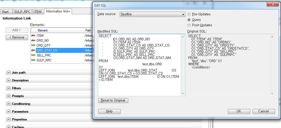 앞서 설명한 것 처럼 Information Link를 사용하기 위해서는 Data Source로 부터 테이블에 속한 Column들을 Information Designer를 이용하여 element로 등록해야합니다. 그리고 이를 가져와서 하나의 Information Link를 구성하게끔 되어있는데 Join 또한 element로 구성해야하기 때문에 복잡한 형태의 SQL문의 경우 구현하기가 어렵거나 아예 불가능한 경우가 있습니다. 그리고 이미 분석가가 만들어 놓은 쿼리가 있을 경우 이것을 하나하나 만들어내는것도 매우 불편한데요.