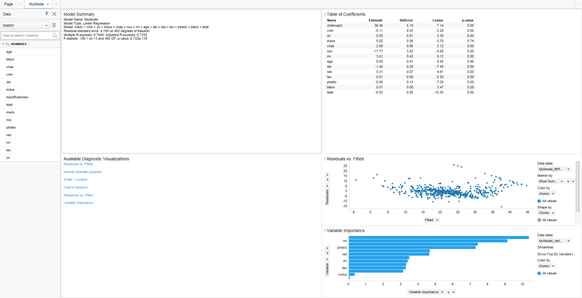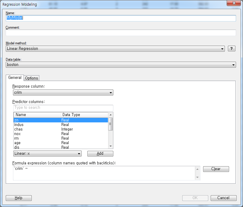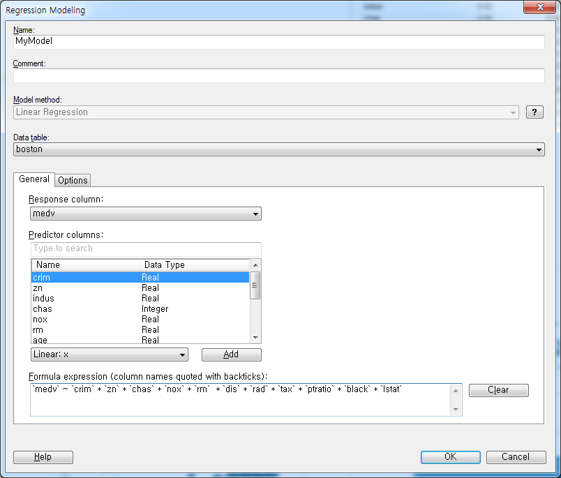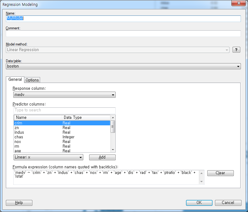 그럼 각 부분에 옵션을 지정해보겠습니다. Name, Comment는 그대로두고 Model method는 Linear Regression, Data Table은 boston을 선택합니다. 예측하고자 하는 대상은 주택가격이므로 medv를 선택하고 나머지 변수는 모두 독립변수로 지정합니다.