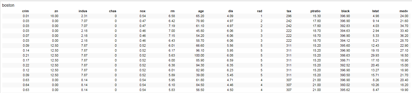 본 예제는 Boston 주택가격 데이터를 활용하여 Regression Modeling을 진행해보겠습니다. Boston 데이터에 대한 설명은 다음의 글을 참조 부탁드립니다. ([Python] 다중회귀분석(Multiple Regression))