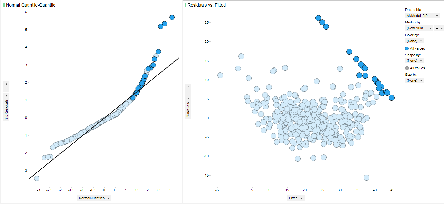 우측 Residuals vs Fitted 에서 사선형태 패턴의 값들을 Marking 해보면 Normal QQ-plot의 상부에 해당하는 것을 확인 할 수 있습니다.