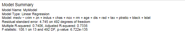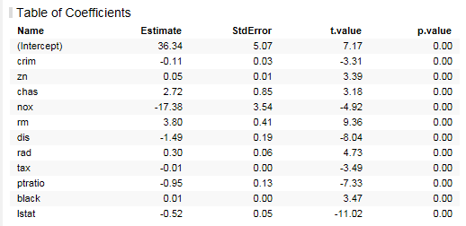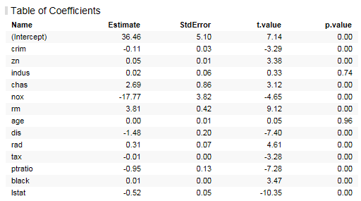 여기서는 각 독립변수에 대한 p-value 값고 Estimate를 확인하면 됩니다. p-value 가 0.05인 경우 통계적으로 유의미한 값이라 할 수 있으며 Estimate는 종속변수에 대한 영향도로 볼 수 있습니다. 위의 결과에서는 indus, age 값이 모두 유의미 하지 않으므로 이를 제외하여 다시 Modeling을 수행합니다.