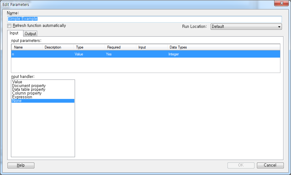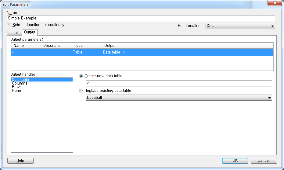 샘플링 갯수를 지정하여 이에 따른 샘플링 결과를 Spotfire로 가져오는 예제입니다. Register Data Functions 를 실행한 후 Name에는 "Simple Example" 이라고 입력하고 아래 Script에 위의 스크립트를 입력합니다.