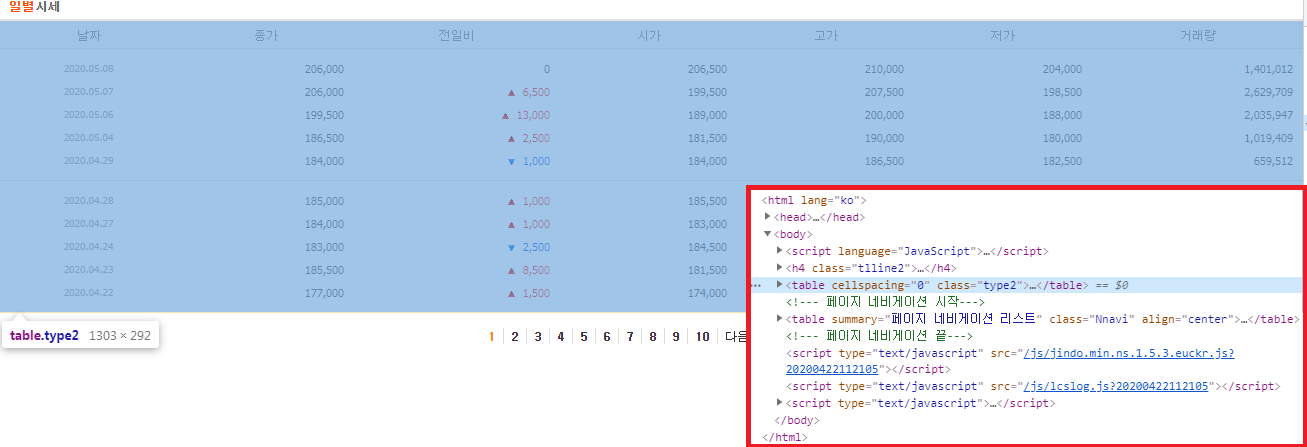 일자별 시세도 1-2) 시간대별 시세와 동일한 방법으로 html 구조를 확인합시다. 먼저 url은 다음과 같습니다.