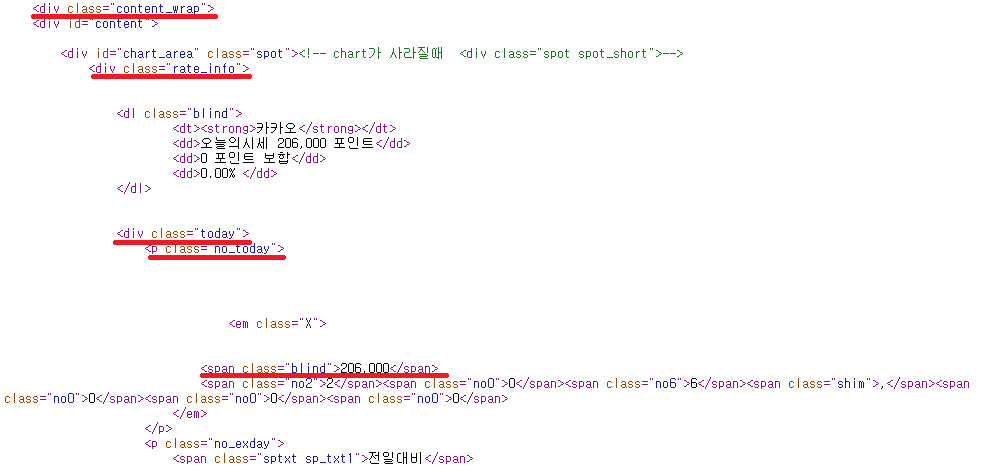 현재가, 고가, 저가,거래량등 개요부분이 있고 아래 쪽으로는 주요시세, 시간별 시세, 일별 시세가 있습니다. 시간별 시세, 일별 시세는 페이지 구조로 구성되어 장기간의 데이터를 얻을 수 있는 구조로 되어있네요. 먼저 개요부분 html을 뜯어봅니다. 카카오 시세가 206,000원으로 되어있는데 이부분을 구조를 보면 아래와 같습니다.
