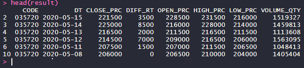colnames(t) <- c('CODE','DT','CLOSE_PRC','DIFF_RT','OPEN_PRC','HIGH_PRC','LOW_PRC','VOLUME_QTY')