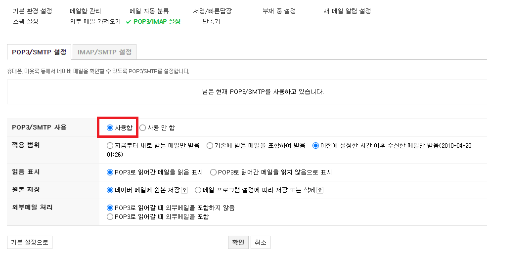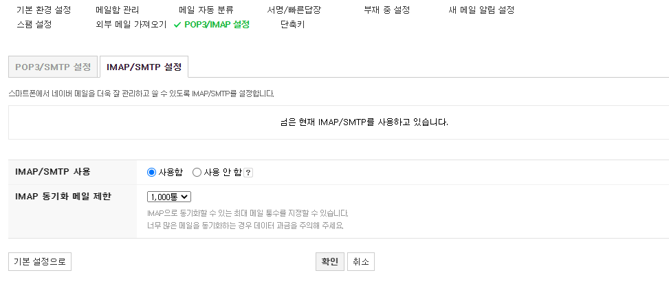 그후 POP3/SMTP와 IMAP/SMTP 모두 사용함으로 설정합니다.
