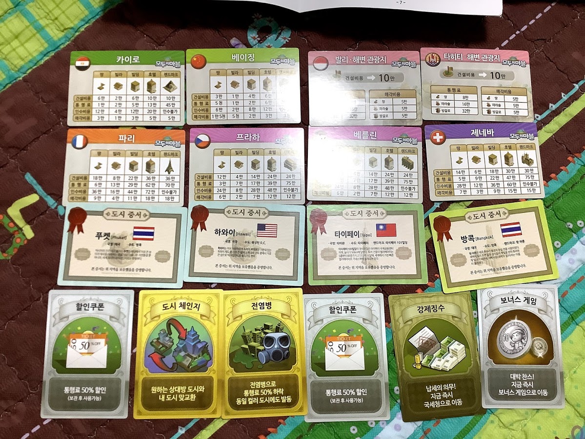 각 도시에서 건물 건축, 통행료, 인수비용, 매각비용 등에 대한 도시별 카드와 포츈카드란에서 뽑을 수 있는 포춘카드가 있습니다. 포춘카드는 즉시사용/보관 후 사용, 공격카드/방어카드 등으로 나뉩니다. 상당히 잘만들어져 있습니다만 보관에는 유의해야겠습니다. 아무래도 아이들과 하는 경우 구겨질 가능성이 높아서... ㅎㅎ