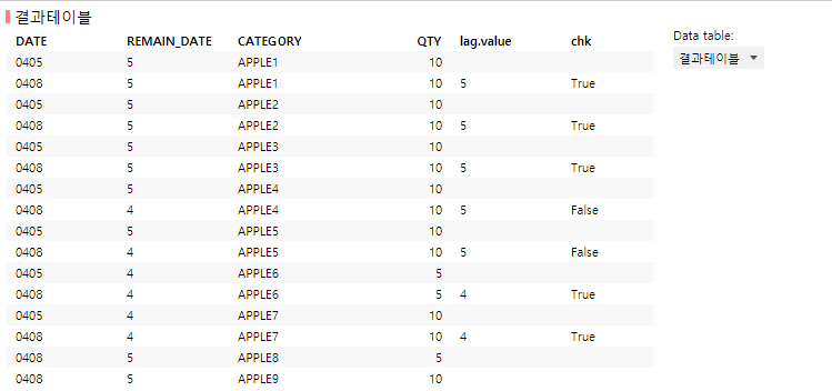 Spotfire에 넣어서 보면 다음과 같습니다. 이미지에서 보는 바와 같이 변경이 된 부분은 CATEGORY에서 APPLE4만 해당이됩니다. 4월3일에서 4일로변경하면서 REMAIN_DATE가 5에서 4로 감소했습니다. 결국 변경 시점을 확인하고 변경 부분을 찾아야하는데 over 함수를 활용하여 전일 데이터를 가져와서 비교하면 될 것 같습니다.