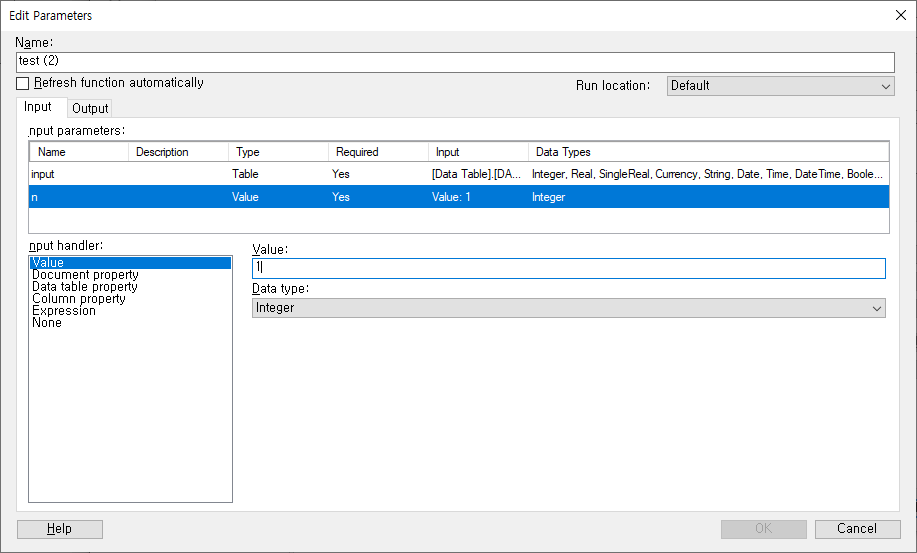 - Input Paramters에 Input 값을 설정합니다.